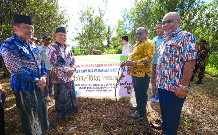 Nabire, PT – Papuapatrolie-news.com, Dalam rangka memperingati Hari Raya Idul Adha 1446 H/2025, Gubernur Papua Tengah, Meki Frith Nawipa, S.H., menyalurkan tiga ekor hewan kurban untuk Pondok Pesantren Riyadhul Qur’an yang terletak di Distrik Wanggar, Kabupaten Nabire Barat, Provinsi Papua Tengah.