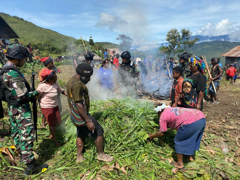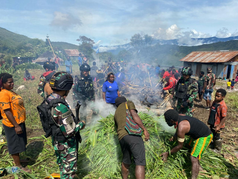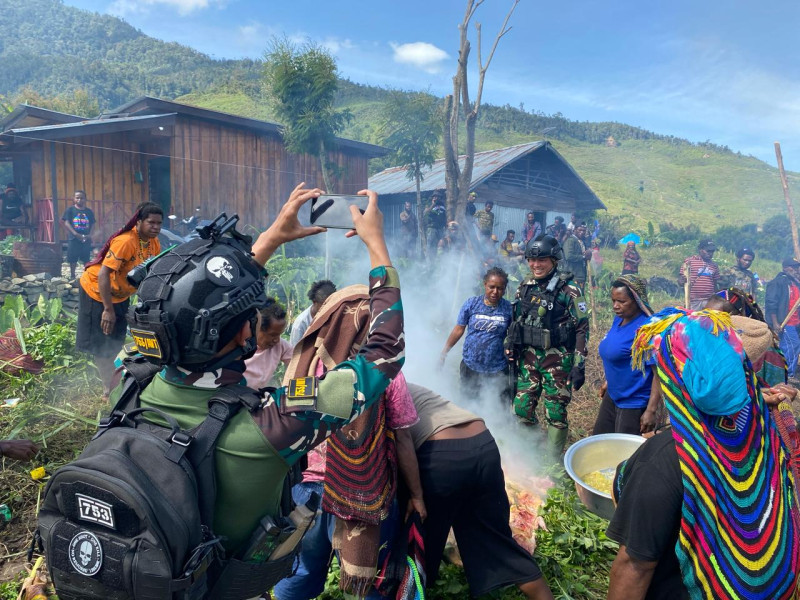 Bakar batu dilaksanakan bersama warga masyarakat di kampung Mulianeri yang berdekatan dengan Pos Satgas Yonif 753/AVT dan warga pun sangat senang dan menyambut baik dengan kehadiran Satgas.