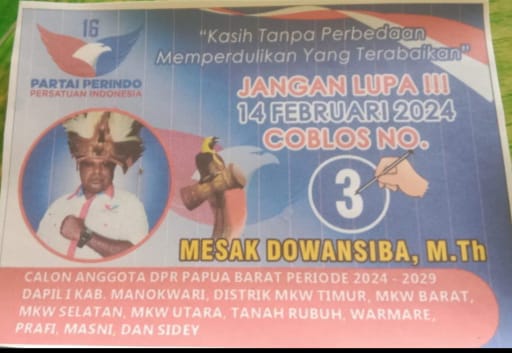Manokwari – Papuapatrolie-News. Com, Memasuki tahun 2024, masyarakat Indonesia bersiap menyambut pesta Demokrasi, menentukan masa depan pemerintahan yang demokratis dan merata. Di Manokwari, Papua Barat, Mesak Dowansiba M. Th, seorang Pemuka Masyarakat, dengan tulus hati maju sebagai calon anggota legislatif dari Partai Perindo daerah pemilihan (dapil) 1 kabupaten Manokwari.