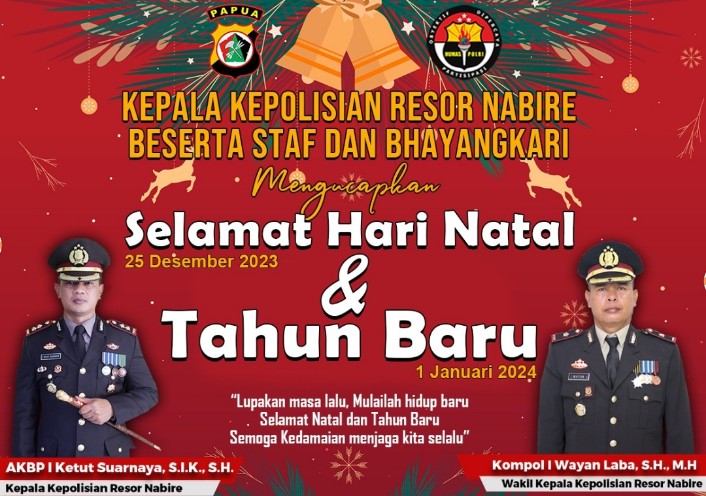 Kepala Kepolisian Resor Nabire Beserta Staf dan Bayangkari Mengucapkan Selamat Natal 25 Desember 2023 danTahun Baru 01 Januari 2024. papuapat24/12/202373 Dilihat Dengan Thema : LUPAKAN MASA LALU MULAILAH HIDUP BARU. Post Views: 73 Pos terkaitHUT Kabupaten Paniai ke-29, Wagub Papua Tengah Ajak Warga Perkuat Persaudaraan dan PembangunanPembangunan Gereja GIDI Anthiokia Dimulai, Wakil Ketua lll DPR Papua Tengah Beri Dukungan PenuhPeletakan Batu Pertama Gereja GIDI, Wagub Papua Tengah Tekankan Kebersamaan JemaatKoordinator SPPG Nabier, Program MBG adalah Investasi Jangka Panjang Bangun Generasi PapuaYayasan TJB Gandeng Dinkes Deiyai, Tawarkan Empat Skema Beasiswa untuk Putra-Putri DaerahKapolda Papua Tengah Dukung Penuh Program Makan Bergizi Gratis di Nabire