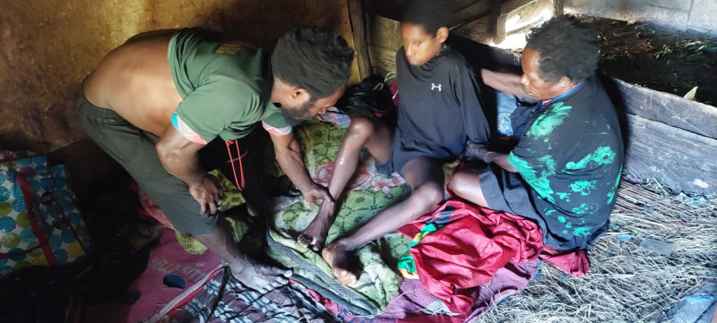 Saudara Yelison Kogoya sudah mengalami luka bakar selama 3 bulan akibat percikan api dari bensin pada saat membuat api tungku dan belum berobat di puskesmas dikarnakan Kondisi kampung yang jauh dari puskesmas setempat sehingga hanya menggunakan pengobatan kampung yang ala kadarnya.
