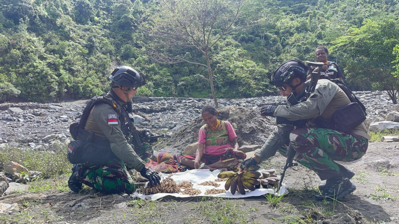 Proses transaksi jual beli tidak hanya sebatas transaksi, melainkan juga melibatkan komunikasi interaktif antara personel satgas dan penjual mama Papua, menciptakan suasana yang penuh keceriaan.