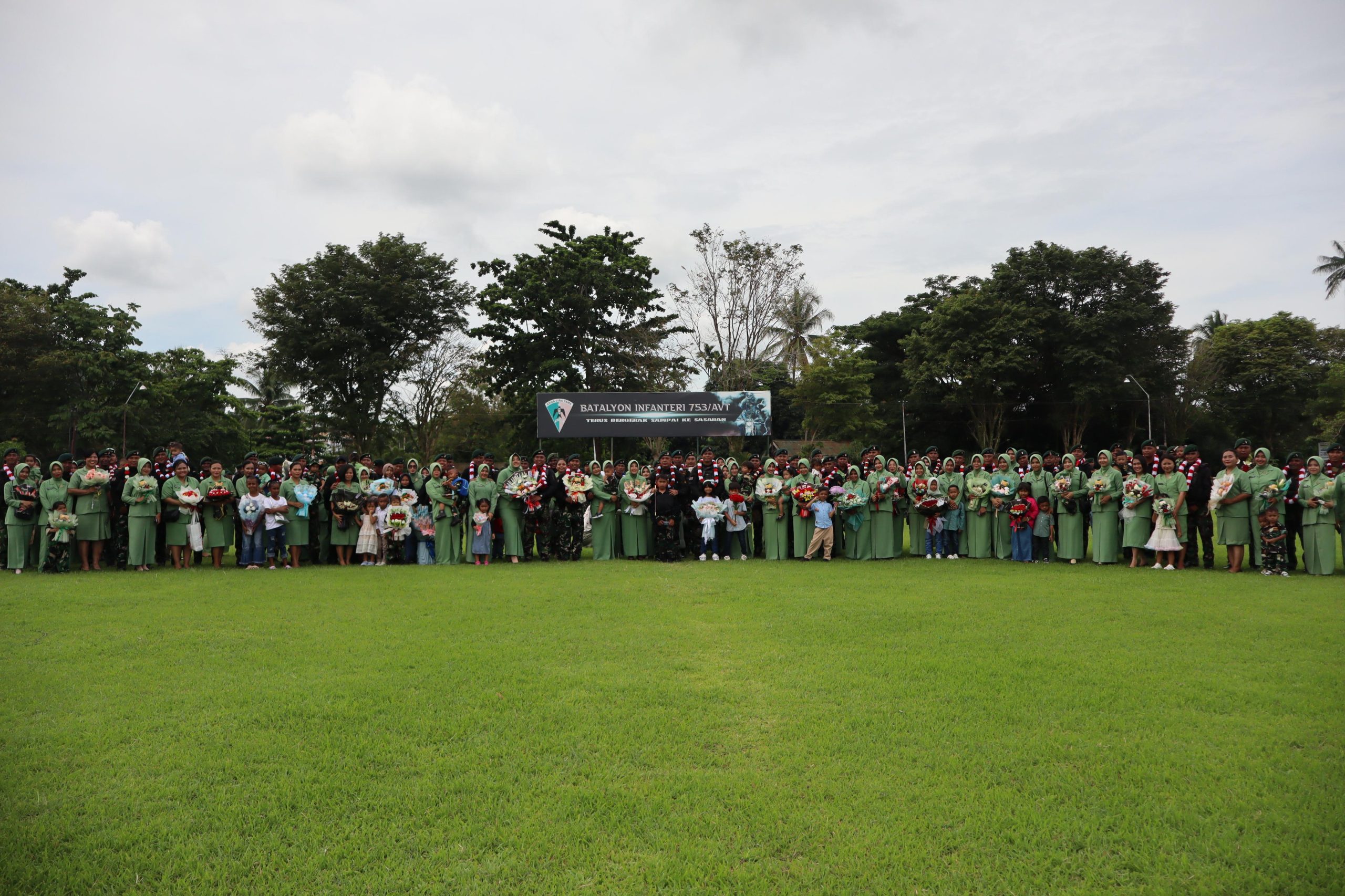 Kedatangan mereka disambut hangat oleh keluarga besar Batalyon Yonif 753/AVT, yang menggelar prosesi penghargaan berupa pengalungan bunga sebagai simbol apresiasi.