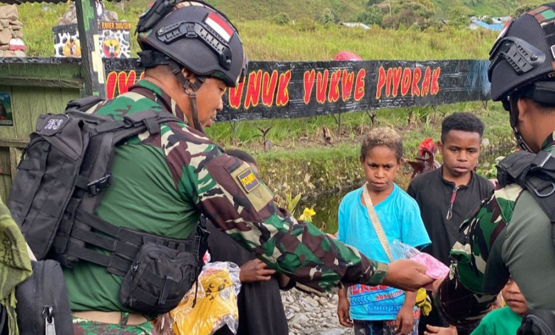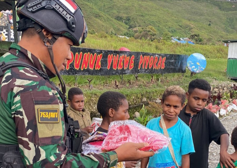 Puncak Jaya – Papuapatrolie-News.Com, Berbagi kepada sesama kepada anak-anak asli papua puncak jaya Satgas Pamtas Kewilayahan Yonif 753/AVT membagikan pakaian layak pakai yang membuat hati perasaan anak-anak papua merasa senang dan gembira kampung pagaleme, Distrik Puncak Senyum, Kab. Puncak Jaya, Minggu (07/01/2024).